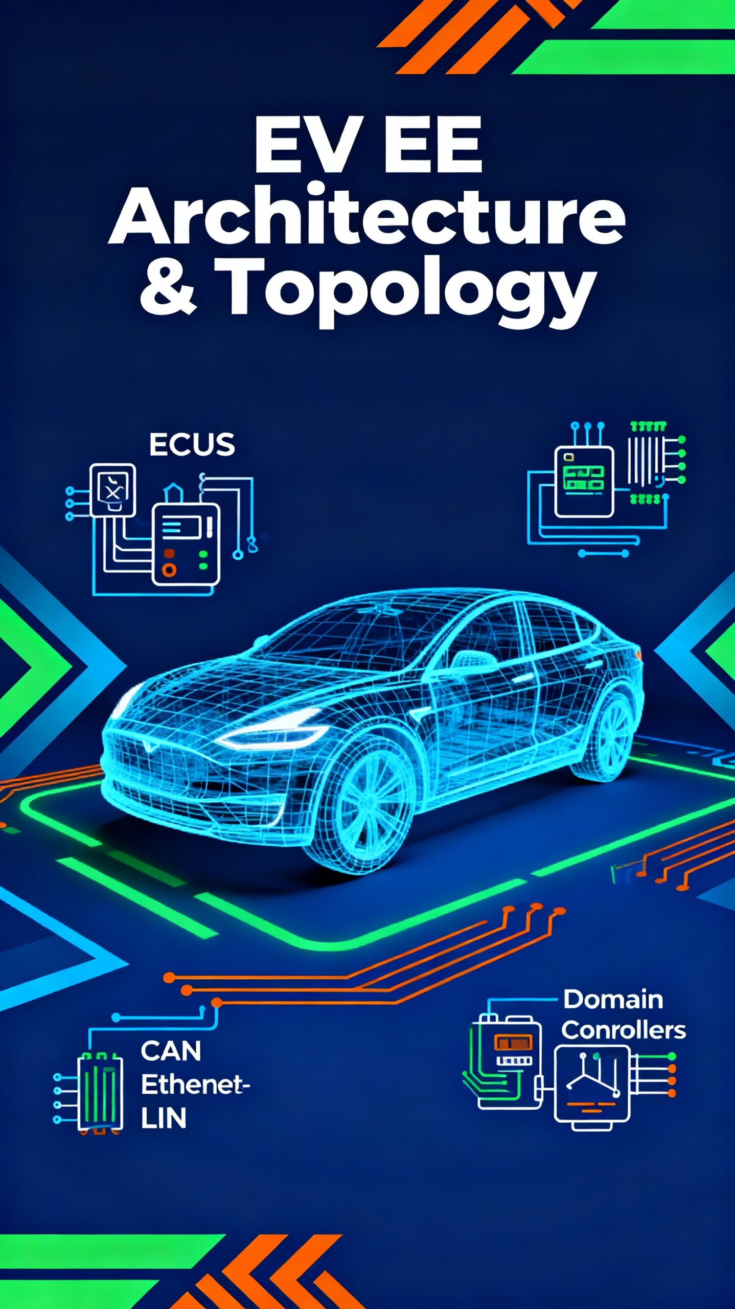 Electrical/Electronic (EE) architecture in electric vehicles defines how electronic control units (ECUs), sensors, actuators, and communication networks are organized and integrated to manage increasingly complex vehicle systems. Modern EE architectures address the challenges of autonomous driving, high-voltage power management, and over-the-air updates while maintaining functional safety compliance.