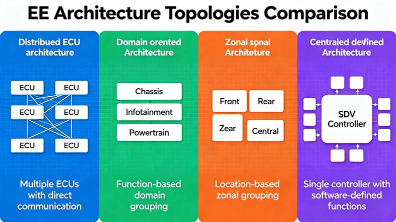 This visualization shows the evolution and comparison of four primary EE architecture approaches used in modern electric vehicles, from traditional distributed systems to cutting-edge centralized software-defined architectures.