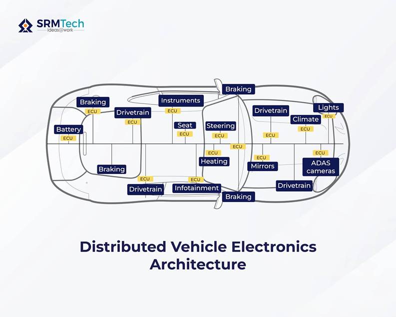 Distributed vehicle electronics architecture showing locations of electronic control units (ECUs) within various systems of a car.