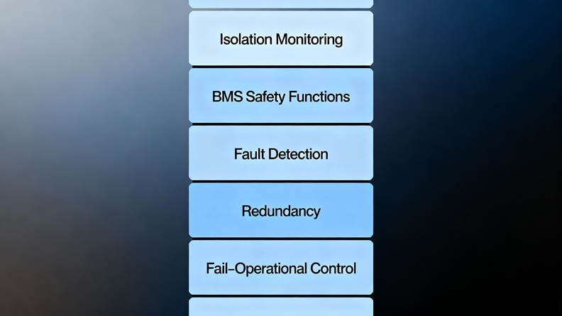 This diagram represents the comprehensive safety framework in EV electrical systems, showing how multiple safety layers work together: isolation monitoring constantly checks insulation between voltage domains, the BMS monitors battery health and prevents thermal runaway, fault detection systems identify anomalies, redundancy mechanisms provide backup functions, and fail-operational control enables degraded operation following failures.