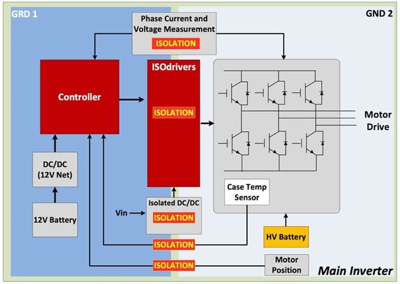 This block diagram illustrates how galvanic isolation protects the low-voltage control circuits from high-voltage motor drive systems. The diagram shows separation between GND1 and GND2 domains, with isolation barriers (marked as “ISOLATION”) between the high-voltage battery and inverter circuits, the controller and motor drive, and measurement sensors. This isolation prevents dangerous current paths while allowing safe data and power transfer.