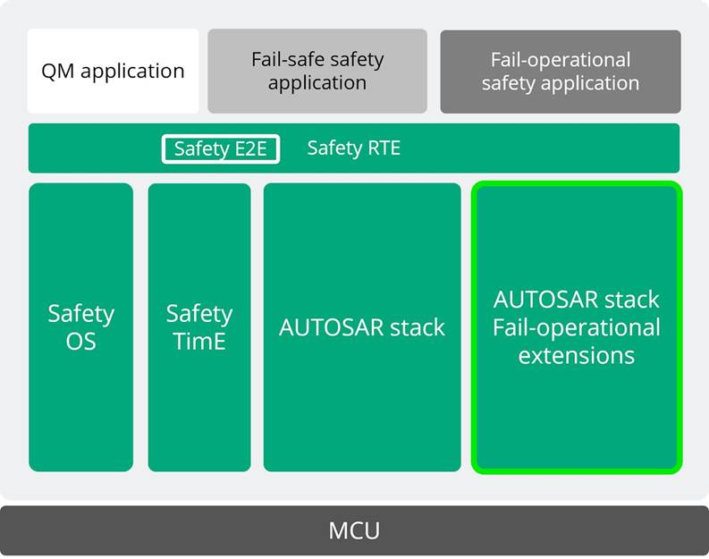 This layered diagram illustrates how fail-operational safety is implemented within the AUTOSAR software stack. The foundation is the microcontroller unit (MCU), above which run the Safety OS, Safety Time, and AUTOSAR stack with fail-operational extensions. Applications are segregated into three types: quality-managed (QM) applications, fail-safe safety applications, and fail-operational safety applications. Safety E2E (End-to-End) and Safety RTE (Runtime Environment) components ensure message integrity and timing across the architecture.