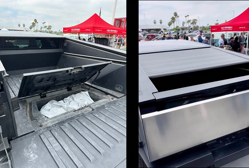 Tesla Cybertruck vault bed with tonneau cover shown open revealing sub-trunk and closed providing secure storage.