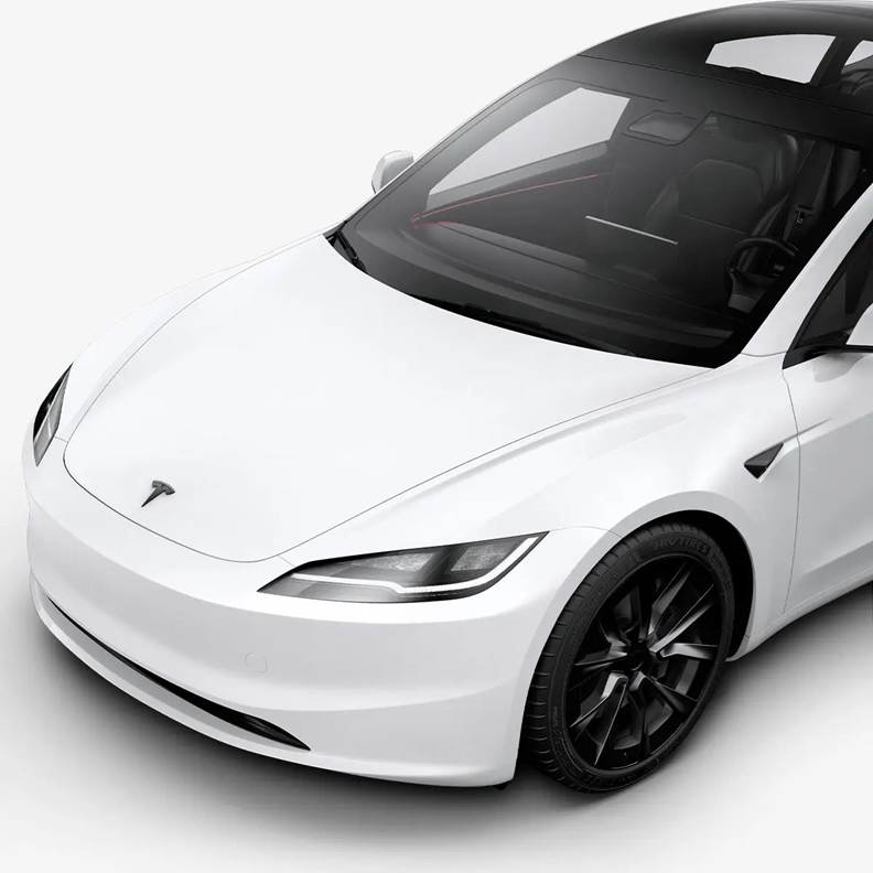 Front view of the 2025 Tesla Model 3 Highland in white, highlighting its sleek design and premium features.