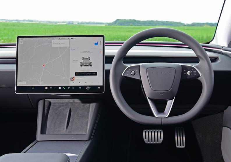 Tesla Model 3 2025 interior dashboard with central touchscreen and minimalist steering wheel design