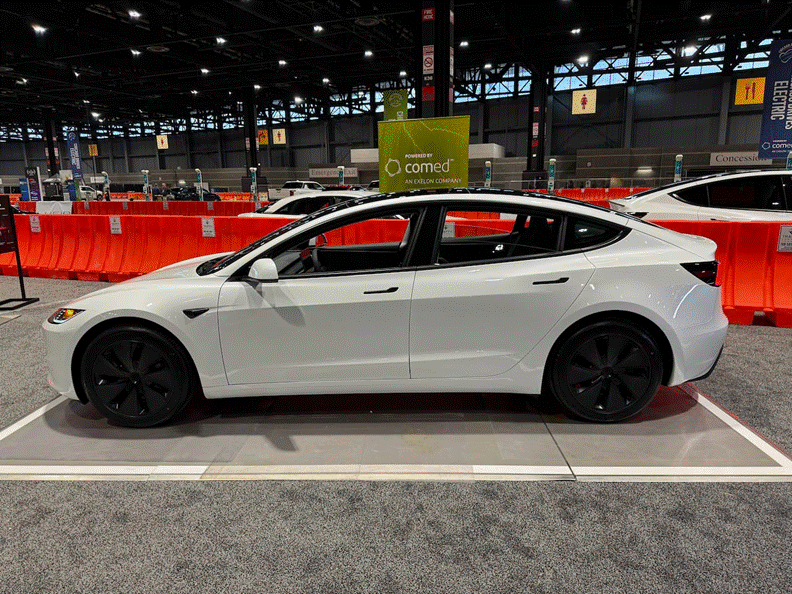 2025 Tesla Model 3 Premium RWD in pearl white shown from the side profile at an indoor exhibition.