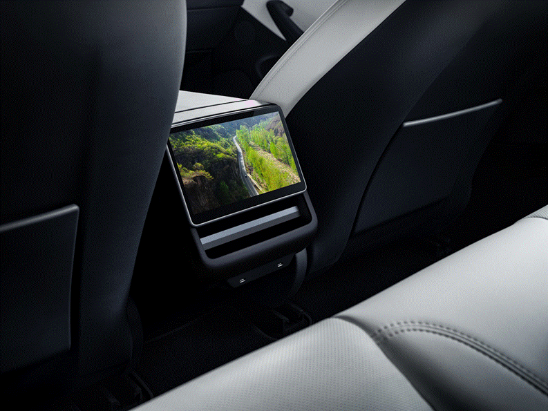 Rear touchscreen and interior rear seats of the Tesla Model 3, showcasing passenger comfort and technology features.