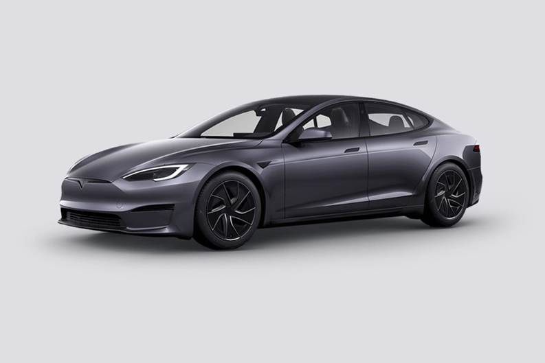 Tesla Model S 2025 front three-quarter view showcasing its sleek design and aerodynamic body.