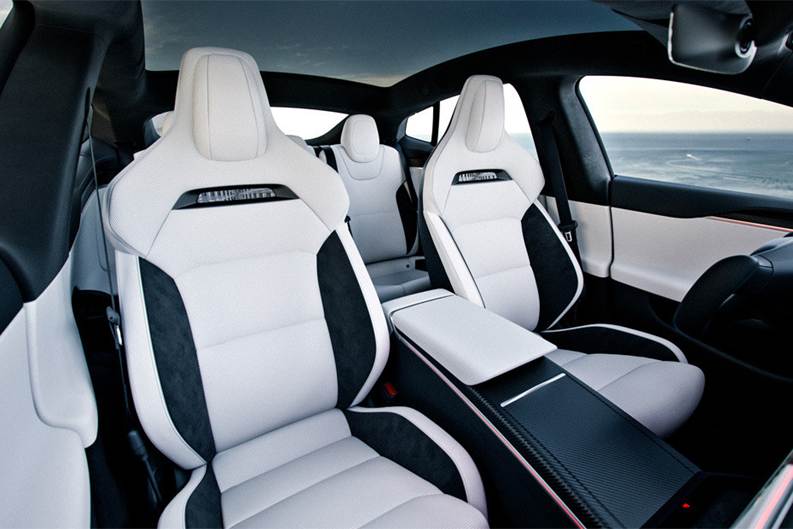Tesla Model S interior showcasing premium white leather seats with black accents and a sleek carbon fiber center console.