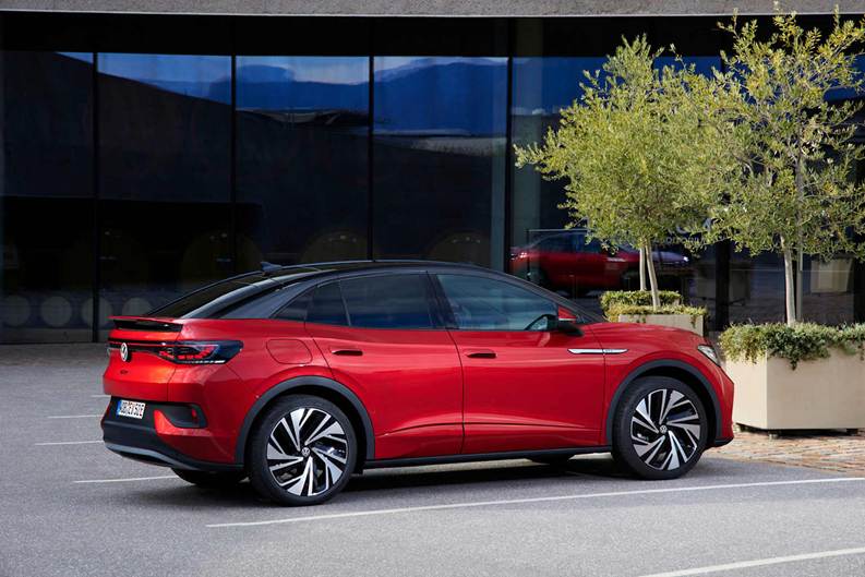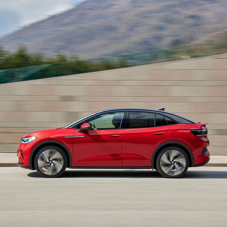 Side profile of a red 2023 Volkswagen ID.5 GTX coupe electric SUV in motion