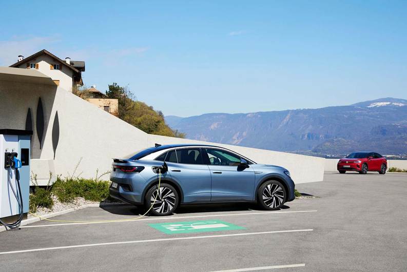 Volkswagen ID.5 GTX electric SUV charging at a DC fast charging station with a scenic mountain backdrop.