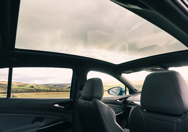 Interior view of Volkswagen ID.5 highlighting the panoramic glass roof that brightens the cabin space.
