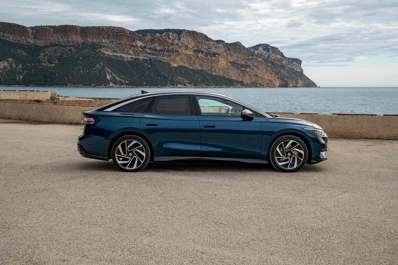 Side profile view of the Volkswagen ID.7 fastback sedan highlighting its aerodynamic design and styling.