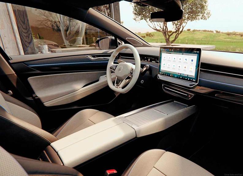 • ID.7: Traditional cockpit layout with physical steering wheel and clear dashboard hierarchy