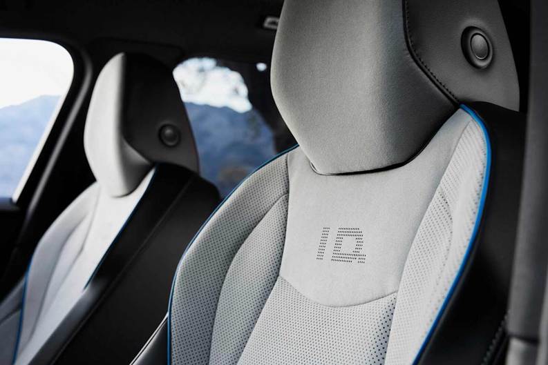 Close-up of the Volkswagen ID.7’s premium front seat featuring perforated leather upholstery and ‘ID’ logo detailing.