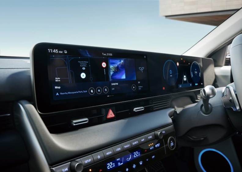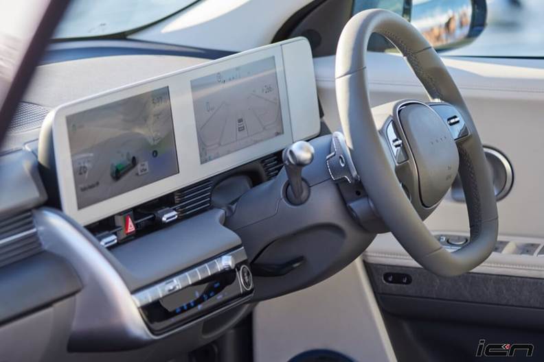 • Ioniq 5: Traditional cockpit with dual screens and physical controls
