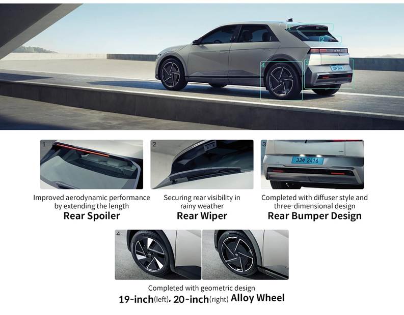 Hyundai Ioniq 5 rear exterior design highlights including spoiler, wiper, bumper, and alloy wheels.