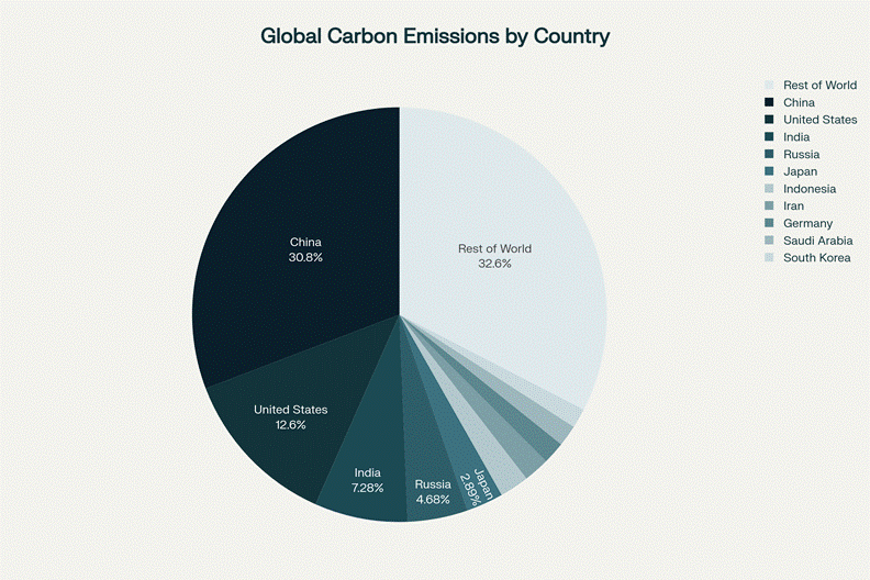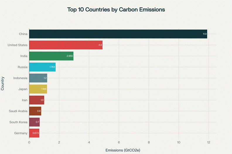 The world’s carbon emissions are highly concentrated among a small number of countries. The top 10 emitters account for approximately 67% of global greenhouse gas emissions, with three countries alone—China, the United States, and India—contributing nearly 51% of the world’s carbon dioxide.