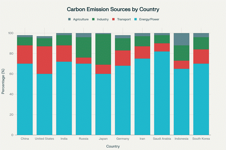 The sources of carbon emissions vary across countries but follow a consistent global pattern. Energy and power generation dominates as the primary source of emissions, accounting for 60-82% of each country’s total emissions. This sector encompasses electricity production from coal and fossil fuels, heating, and industrial energy use.