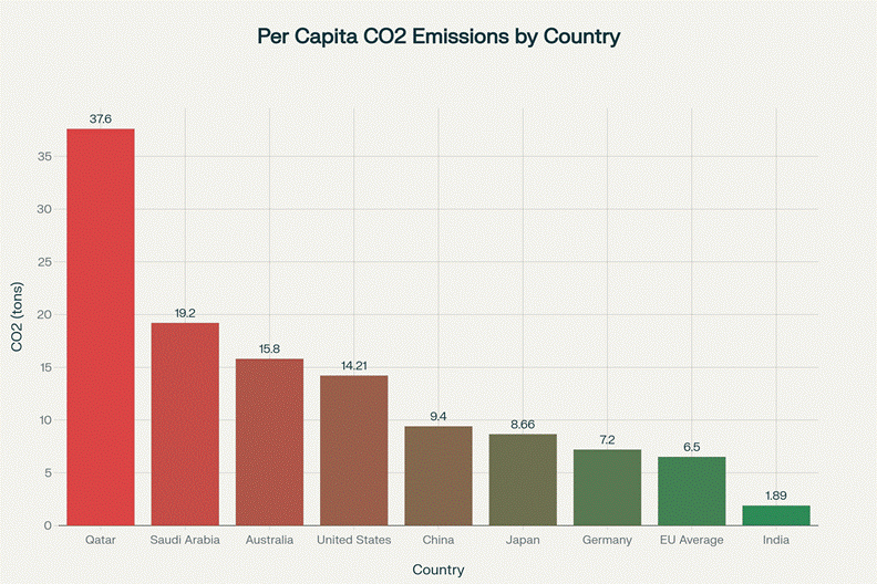 • Reveals individual carbon footprints (Qatar 37.6 tonnes vs India 1.89 tonnes)