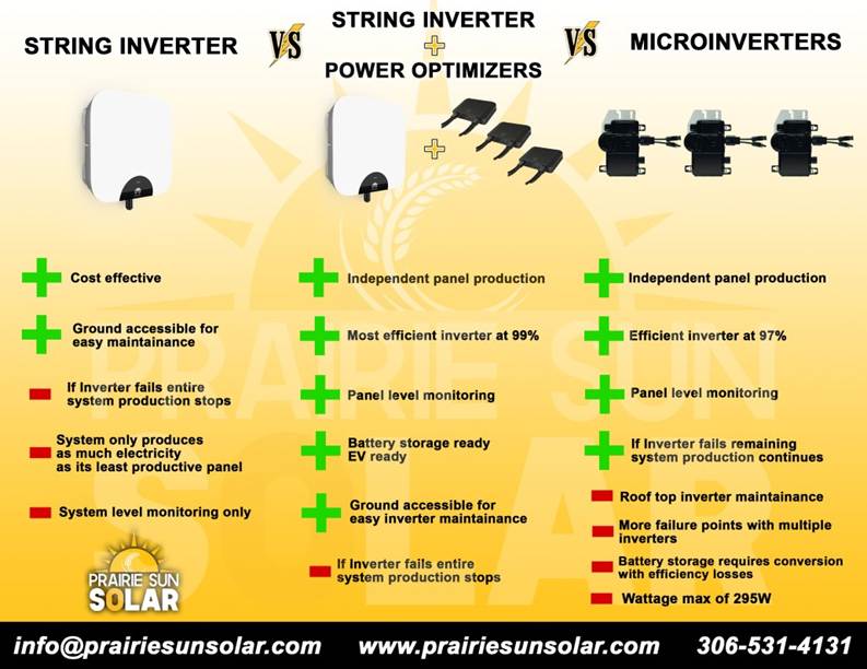 Comparison of string inverter, string inverter with power optimizers, and microinverters for solar power systems highlighting pros and cons.